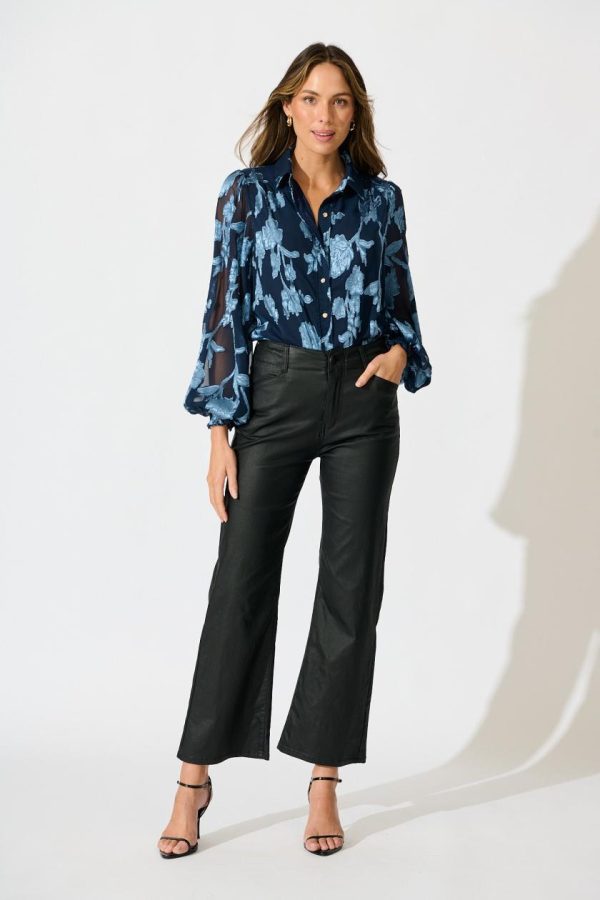 Women Irene Shirt In Navy With Blue Floral Burnout Chiffon | St Frock Party & Occasion