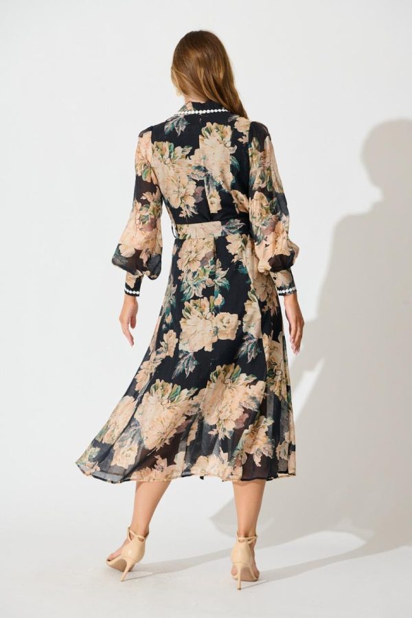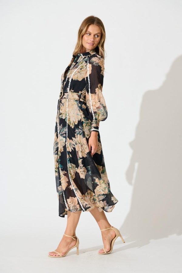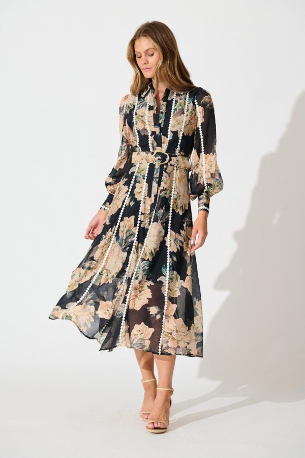Women Lovingly Maxi Shirt Dress In Black Floral With Contrast Trim | St Frock Party